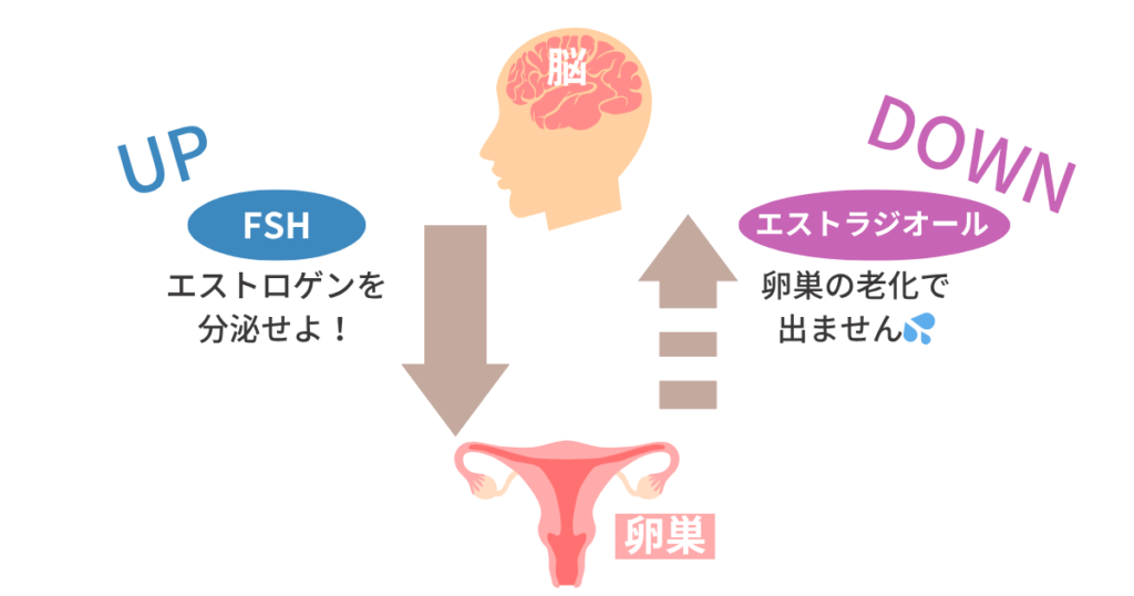 卵巣の機能は30代後半から少しずつ低下し、閉経に近づくほどそのスピードは加速します。卵巣機能が衰えるとエストラジオールの分泌は減少し、それを補おうとして下垂体が「もっとエストロゲンを分泌しなさい」と指令を出すため、FSHの分泌量が上昇するのです。