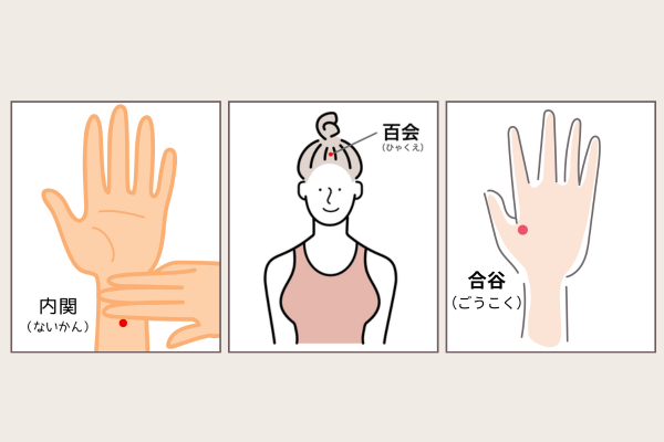 - 内関(ないかん):手首の内側にある横紋から、指3本分ほど肘側へ進んだ場所